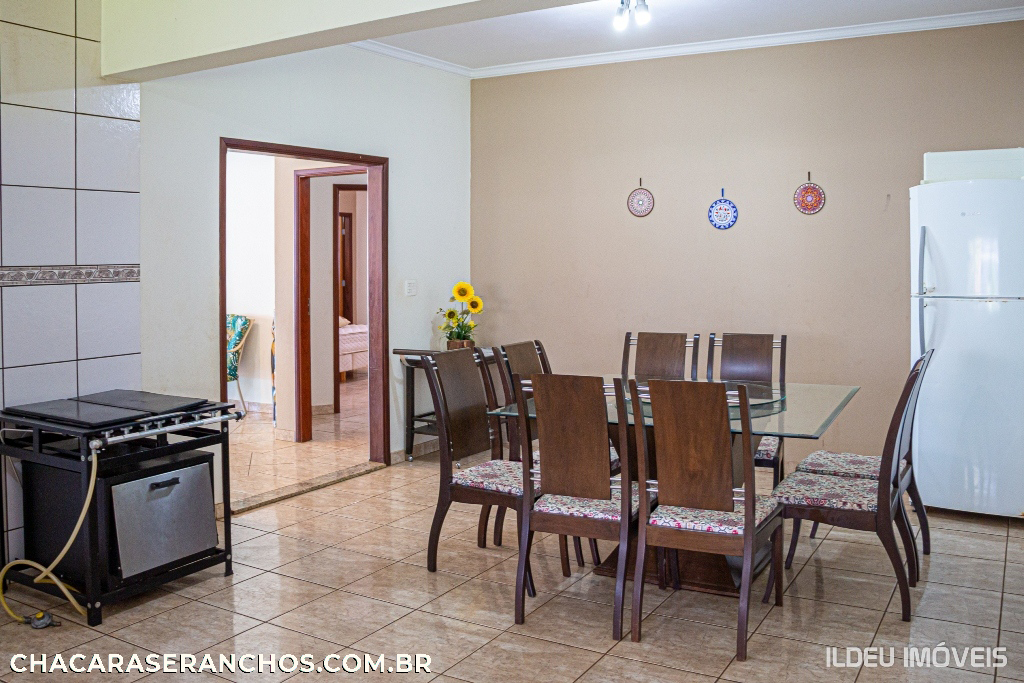 CASA COM 05 DORMS, SENDO 02 SUÍTES MAIS 01 WC SOCIAL, SALA DOIS AMBIENTES. ÁREA DE LAZER COM PISCINA ADULTA, CHURRASQUEIRA ALVENARIA, FOGÃO E FORNO A LENHA, 02 WC. SALÃO CAPACIDADE P/ 60 PESSOAS ACOMODAÇÕES 20 PESSOAS ENTRE CAMA E COLCHÃO.